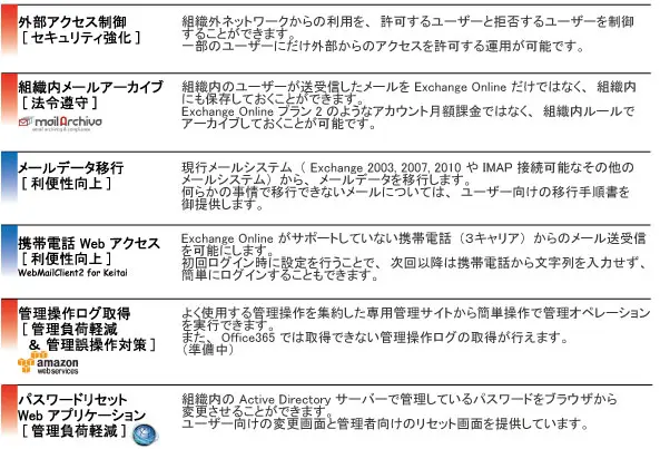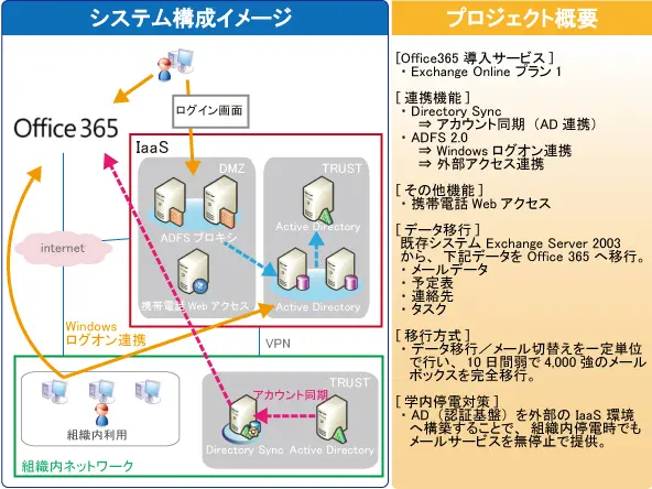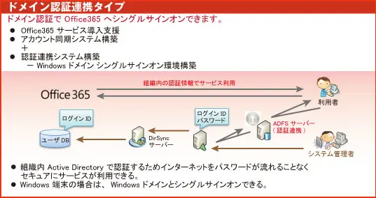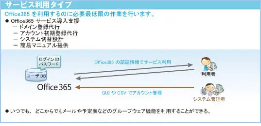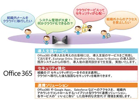 メール・予定表・ワークスペース共有・ユニファイドコミュニケーションといった機能をもつMicrosoft Office365(for Enterprise, for Education)への移行・導入支援を行います。マイクロソフト製品を初めて導入されるお客様はもちろん、すでにお持ちのオンプレミス(組織内設置)や、Active Directoryとのユーザーアカウント同期、SAML認証連携、およびExchange Serverなど既存のメールシステムからのメールデータ移行に関するご支援が可能です。